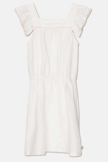 Este vestido de lino es un llamado al verano. Tu hija disfrutará del clima soleado con estilo con esta prenda imprescindible. Vístelo de manera elegante o informal y deja que tu hija lo use para celebraciones de temporada o paseos nocturnos por la playa. Hecho de lino 100 % certificado con lino europeo, este vestido de verano tiene un escote cuadrado, mangas con vuelo y un corte acampanado. Está doblado en el pecho y presenta una cinturilla elástica fruncida. Los detalles de encaje en las mangas y el pecho lo hacen aún más adorable. Disponible en arena, coral, marfil y azul cielo.