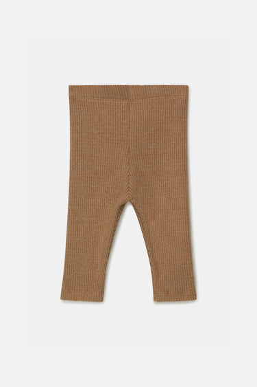 Estos leggings de canalé para bebé tienen una cinturilla elástica y un bolsillo de parche en la parte posterior. Estos leggings de canalé suave, orgánicos y reciclados, certificados por GRS, están hechos de 58 % algodón reciclado, 38 % algodón orgánico y 4 % elastano. Disponibles en camel, gris oscuro y gris claro.