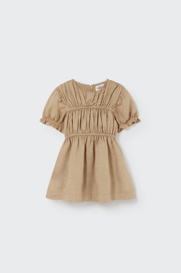 Vestido de lino para bebés. Cuello redondo con puntilla. Cierre con botón detrás en el cuello. Ajustado en el cuerpo. Efecto abullonado. Mangas cortas y elásticas. Forrado con Voile de algodón.