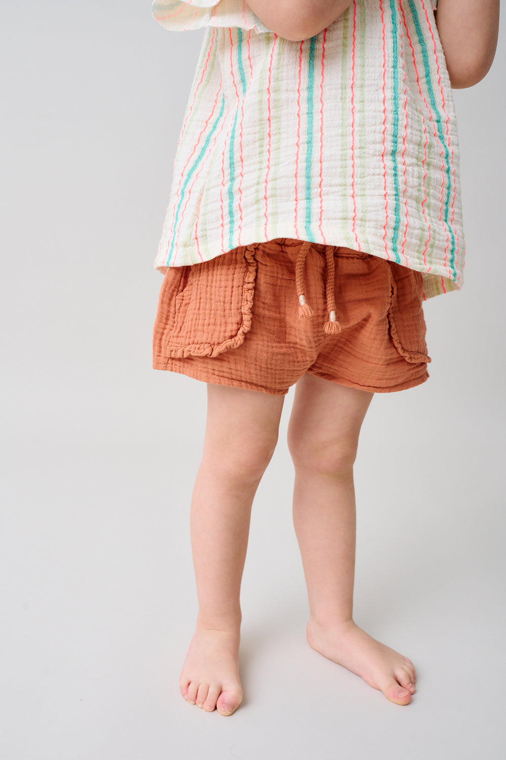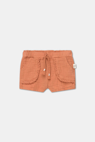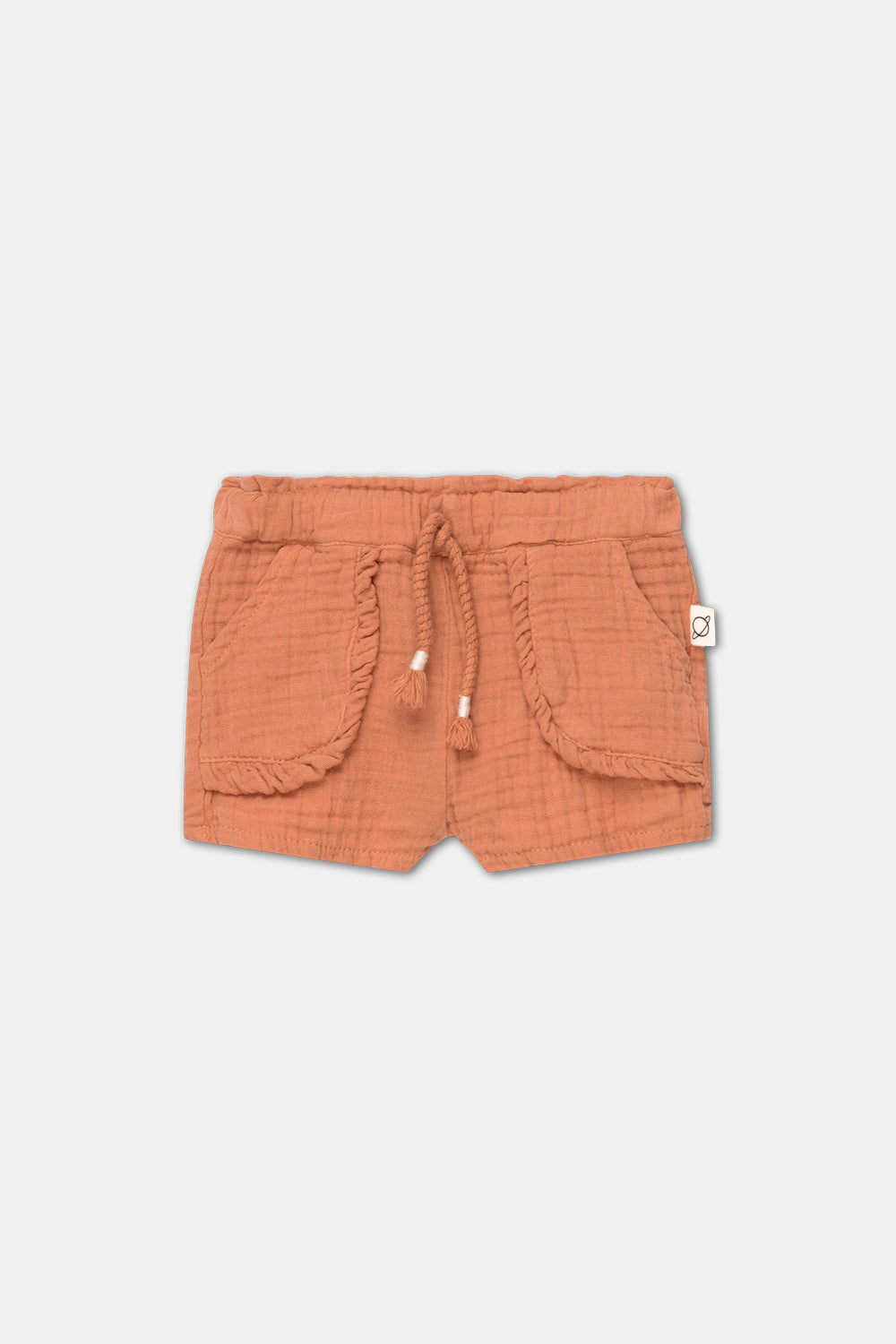 Shorts de gasa orgánica con bolsillos laterales con volantes y cinturilla elástica con cordón decorativo.