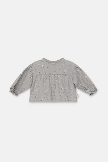 Esta blusa floral, tejida en muselina de algodón, presenta un cuello redondo con detalles de volantes, cierre con botones de madera en la espalda y puños elásticos. Costura fruncida en la parte superior.