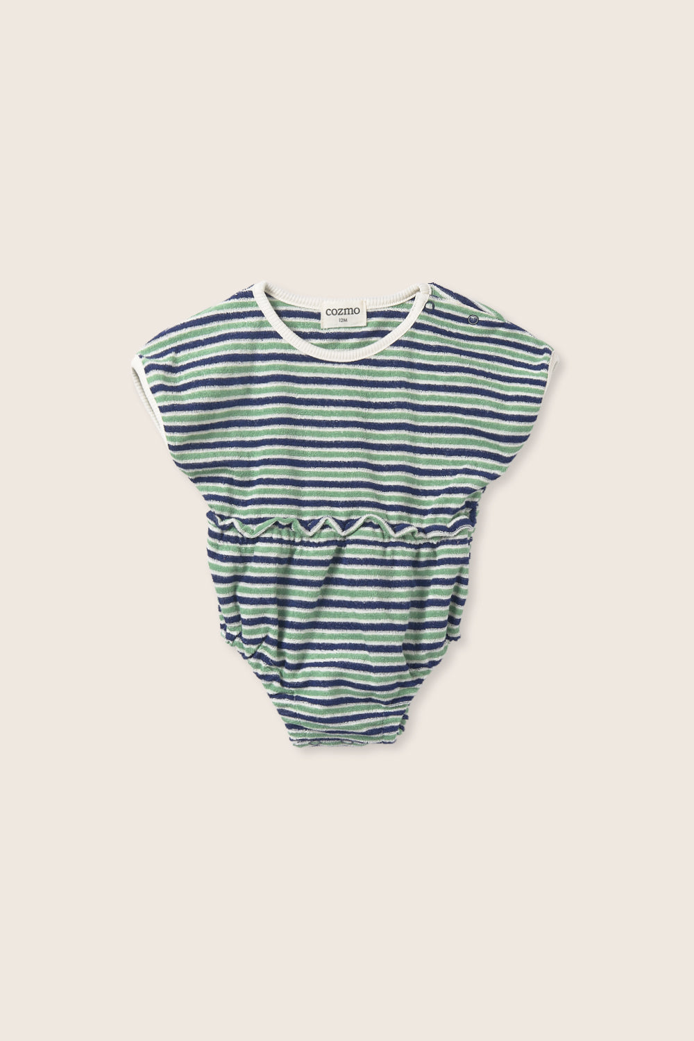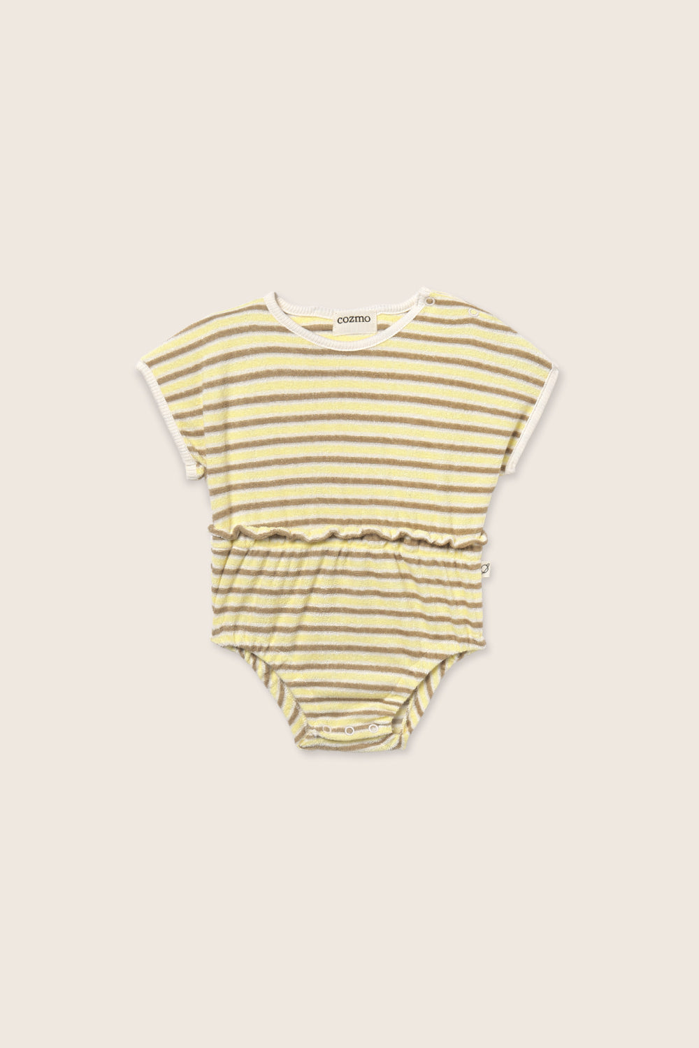 Ranita de rayas para bebé y niña pequeña en felpa suave de tejido toalla. Presenta cuello redondo, botones a presión en el hombro izquierdo y en la entrepierna para facilitar el cambio, hombros ligeramente caídos, cintura fruncida con elástico y aberturas elásticas en las piernas para un ajuste cómodo y ligeramente entallado.