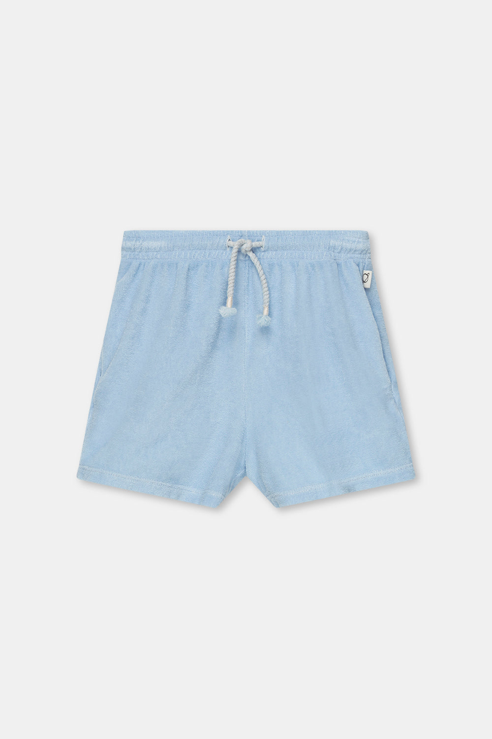 Estos pantalones cortos de toalla orgánica cuentan con dos bolsillos laterales y una cinturilla elástica con cordón.