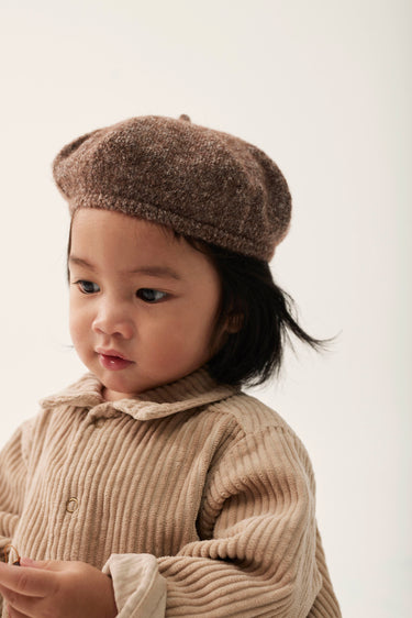 Boina confeccionada en una suave y esponjosa mezcla de lana y tricot de poliamida reciclada. Textura sutilmente moteada. Cálida y acogedora, perfecta para bebés. Forma parte de nuestra colección de ropa reciclada para bebés .