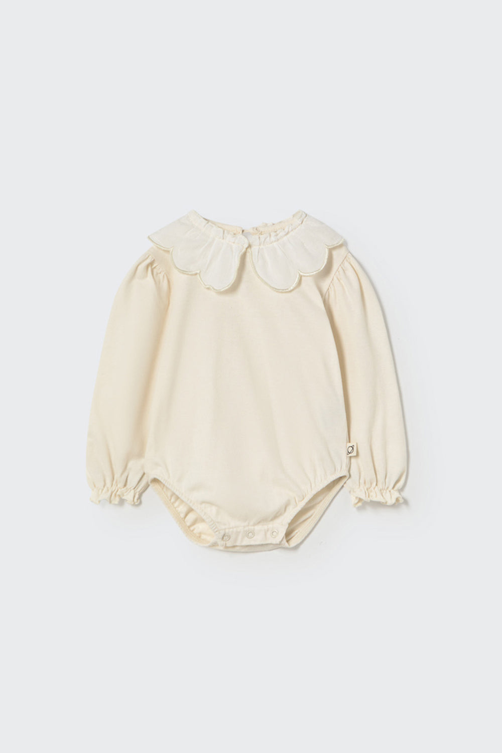 Body para bebé confeccionado en algodón orgánico con un acabado cepillado para mayor calidez y suavidad. Presenta cuello de voile de algodón con volantes y ribetes ondulados, y puños fruncidos con volantes a juego. Las perneras elásticas y los botones a presión en el refuerzo facilitan el momento de vestir. Tiene también una abertura trasera en forma de lágrima.