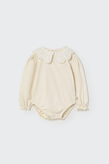 Body para bebé confeccionado en algodón orgánico con un acabado cepillado para mayor calidez y suavidad. Presenta cuello de voile de algodón con volantes y ribetes ondulados, y puños fruncidos con volantes a juego. Las perneras elásticas y los botones a presión en el refuerzo facilitan el momento de vestir. Tiene también una abertura trasera en forma de lágrima.