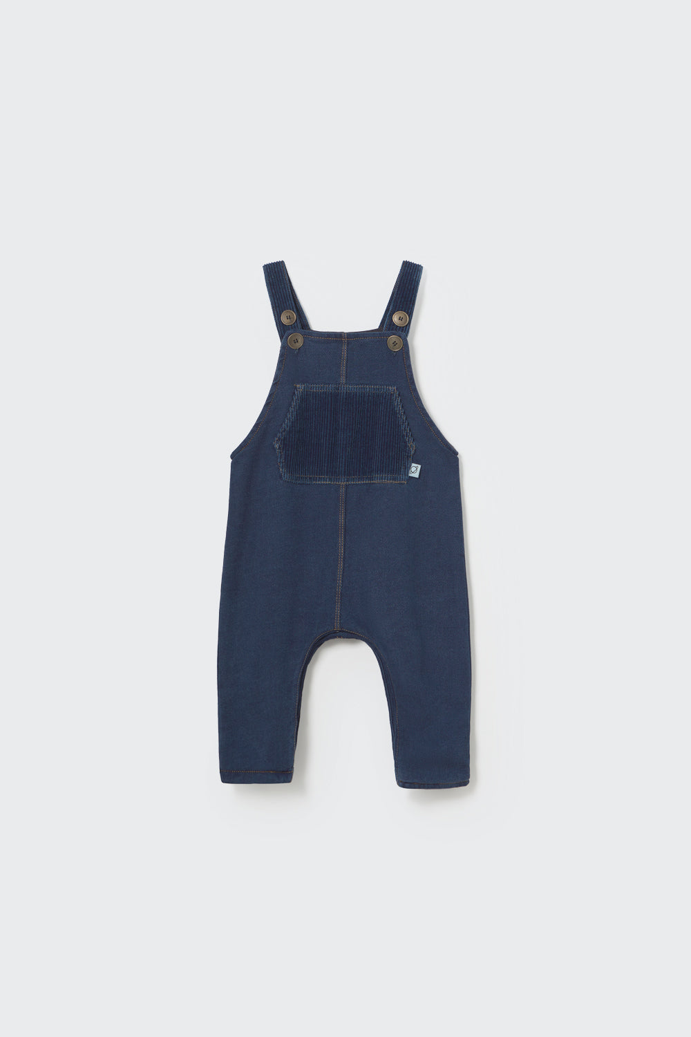Peto para bebé confeccionado en 100% algodón sostenible, certificado por la Better Cotton Initiative (BCI) con un tejido de sarga. Cuenta con tirantes ajustables que se anudan con botones al frente, decorados con un tejido de pana vaquera. Este peto para bebé incluye costuras centrales y un bolsillo tipo canguro también en pana vaquera. Los botones a presión en las piernas facilitan el cambio de pañal. Este peto está completamente forrado para un mayor comfort.