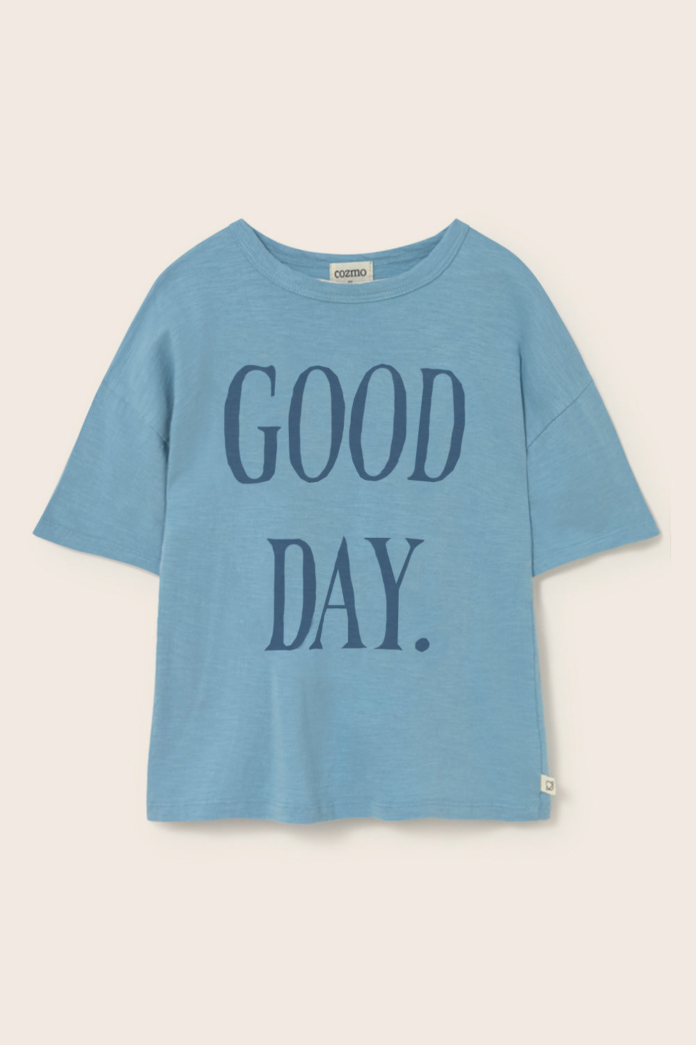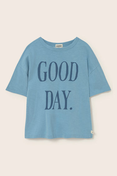Camiseta para niño en algodón flamé muy ligero. Presenta cuello redondo, hombros ligeramente caídos con mangas cortas y un motivo estampado con el mensaje “good day”.