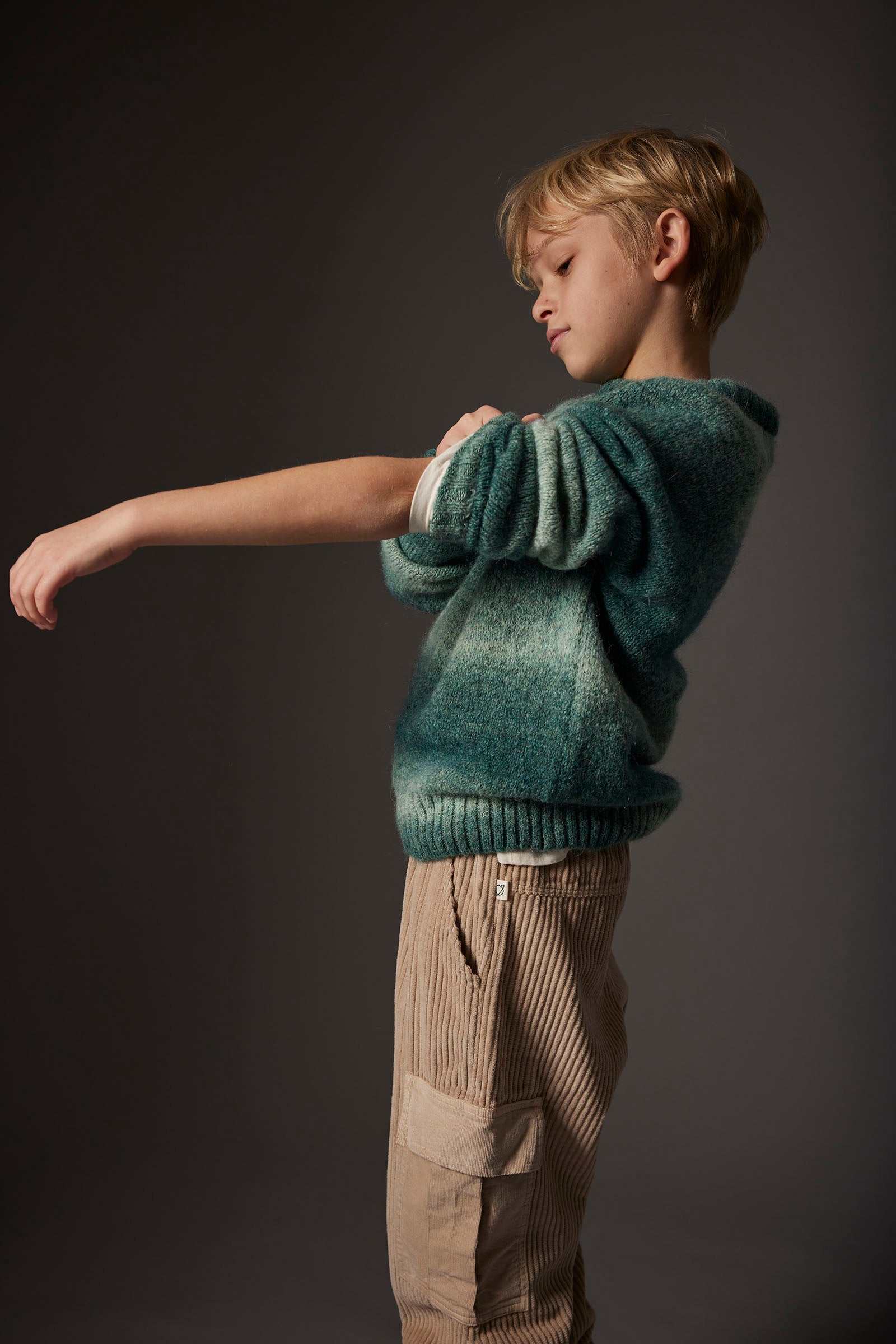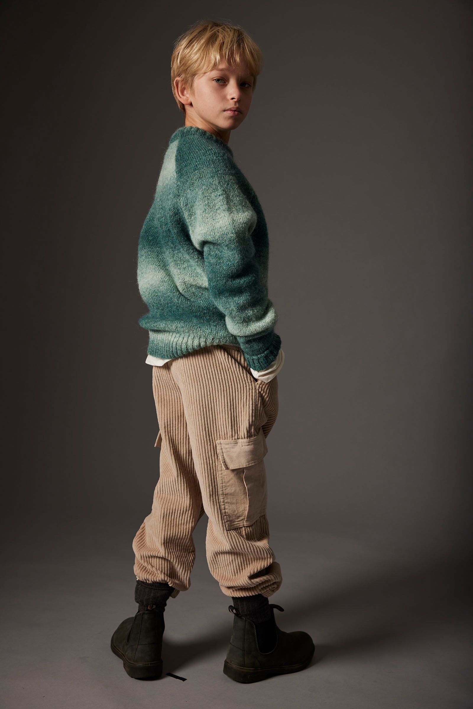 Este suéter para niños está confeccionado en tricot suave teñido en una acogedora mezcla de mohair y lana, que ofrece una calidez duradera y una sensación suave al tacto. Diseñado con mangas raglán para facilitar el movimiento y acabado con ribete en cuello, puños y bajo para un ajuste cómodo.