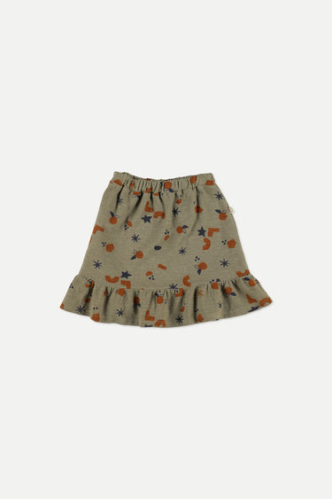 Falda de algodón orgánico de doble cara con estampado de formas. Cintura elástica y bajo con volante. Teñida en prenda. 98% algodón orgánico, 2% poliéster reciclado.