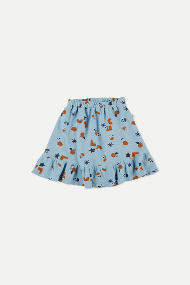 Falda de algodón orgánico de doble cara con estampado de formas. Cintura elástica y bajo con volante. Teñida en prenda. 98% algodón orgánico, 2% poliéster reciclado.