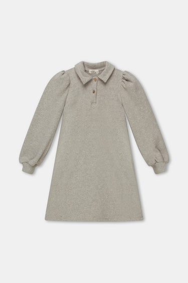 Este vestido tiene cuello vuelto, cierre de botones en la parte delantera, hombros abullonados, mangas largas, puños acanalados y dobladillo recto. Tejido de punto suave orgánico reciclado 58 % algodón reciclado, 38 % algodón orgánico, 4 % elastano. Disponible en gris claro, gris oscuro y camel.