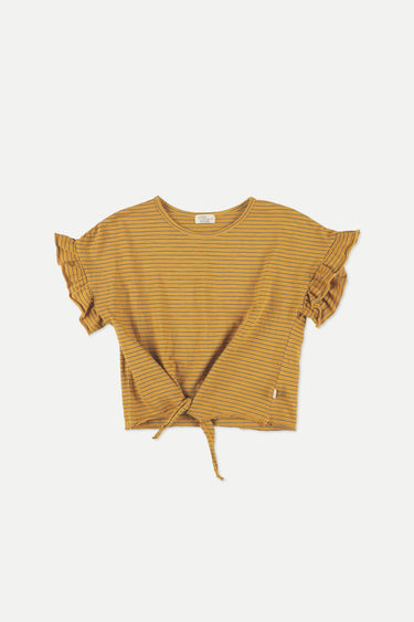 Camiseta de rayas de algodón orgánico flameado, ligero y muy suave. Cuello redondo y mangas con vuelo. Nudo en la parte delantera. 87 % algodón orgánico, 13 % poliéster teñido en prenda.