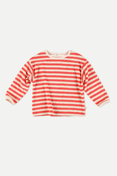 Sudadera de rayas en tejido de rizo de algodón orgánico súper suave y cómodo. Cuello redondo, hombros caídos y dobladillo recto. 80 % algodón orgánico, 20 % poliéster reciclado. Tejido de punto