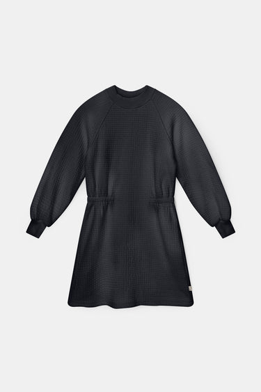 Este vestido presenta cuello redondo, mangas largas raglán, puños y escote de canalé, bajo recto y detalles elásticos en la cintura. El punto tiene efecto acolchado y está confeccionado en 100 % algodón. Disponible en marfil, rosa y gris oscuro.