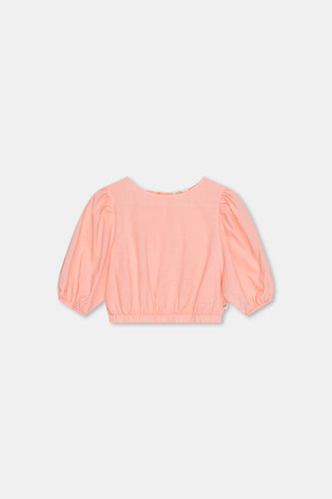 Este top corto de popelina ligera presenta cuello redondo, mangas voluminosas con puños elásticos, cinturilla elastizada y una tapeta de botones en la espalda.