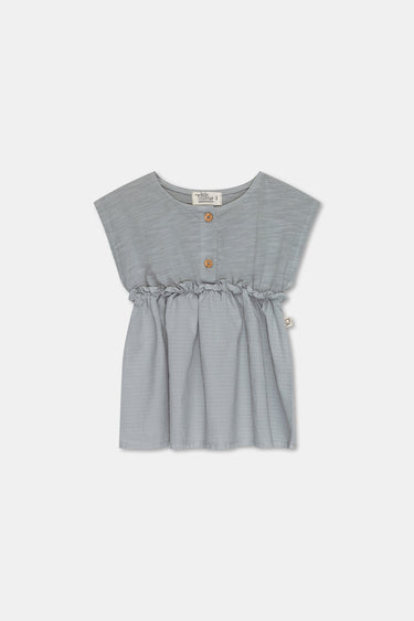 Este vestido orgánico de tejido irregular sin mangas presenta cuello redondo y cierre de botones en la parte delantera. Está fruncido en el busto con una falda de tejido liso.