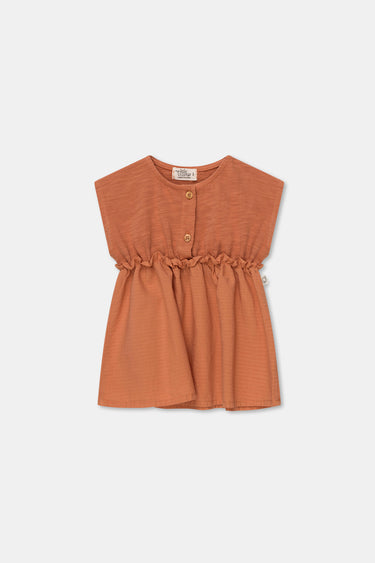 Este vestido orgánico de tejido irregular sin mangas presenta cuello redondo y cierre de botones en la parte delantera. Está fruncido en el busto con una falda de tejido liso.