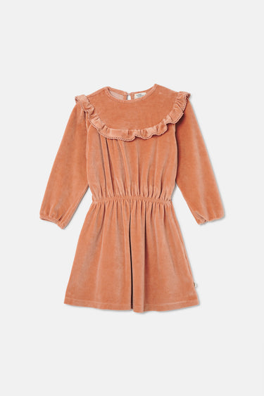 Vestido de terciopelo con canesú redondeado fruncido con volantes y pasamanería de encaje. Cierre de botones en la espalda. Elástico en cintura y puños. Extra suave y cálido. 83% algodón, 17% poliamida. Tejido de punto Las fibras de esta prenda están certificadas como sostenibles por la Better Cotton Initiative (BCI).