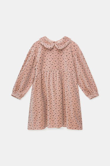 Este vestido, diseñado con un estampado de cerezas, tiene cuello Peter Pan, una tapeta posterior con botones, hombros relajados y mangas largas. Puños y cintura fruncidos para mayor volumen. Disponible en gris claro, mostaza y rosa suave.