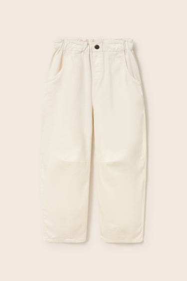 Pantalón para niña en sarga de algodón cómoda y elástica. Presenta cintura elástica ajustable, botón decorativo con falso delantero, canesú trasero, bolsillos laterales, dos bolsillos de parche traseros y pliegues delanteros y traseros para un look clásico y cuidado.