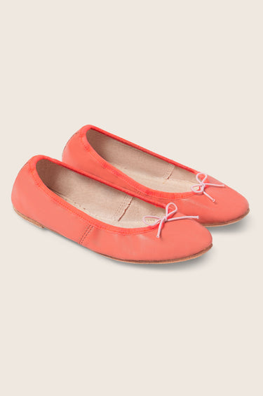 Bailarinas para niña artesanales hechas en España en tono rosa empolvado. Rematadas con ribete en rosa neón y lazo rosa claro en contraste en el delantero.