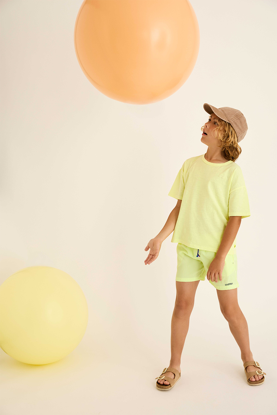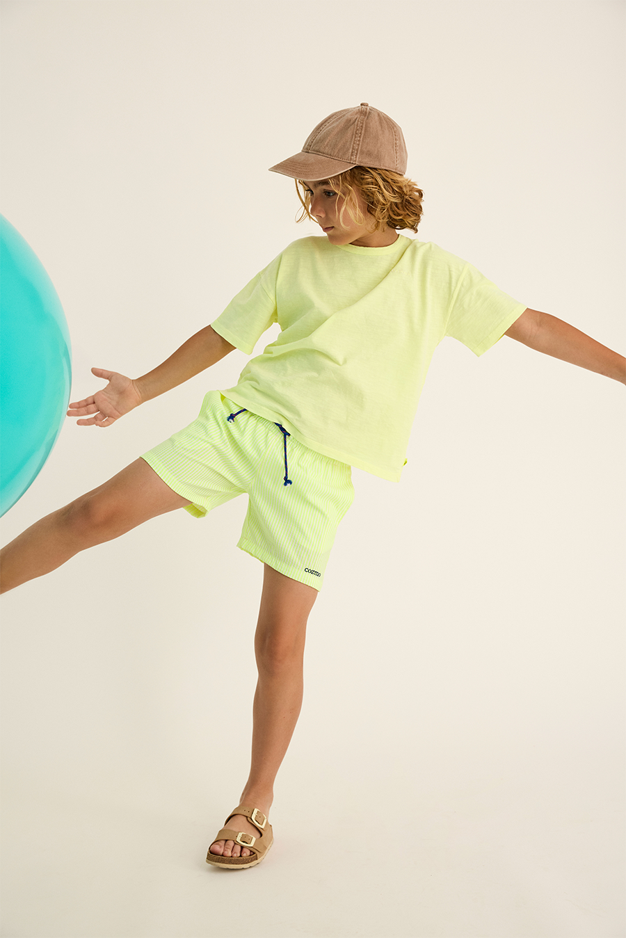 Confeccionado con una mezcla de tejidos reciclados, este bañador no solo cuida a tus pequeños del sol, ¡sino también del planeta! Su diseño a rayas en colores neón hará que tu niño destaque en la playa o la piscina, mientras que su cintura elástica con cordón ajustable garantiza un ajuste perfecto en todo momento. Además, se seca rápidamente y es increíblemente resistente—ideal para esos días llenos de juegos sin parar.