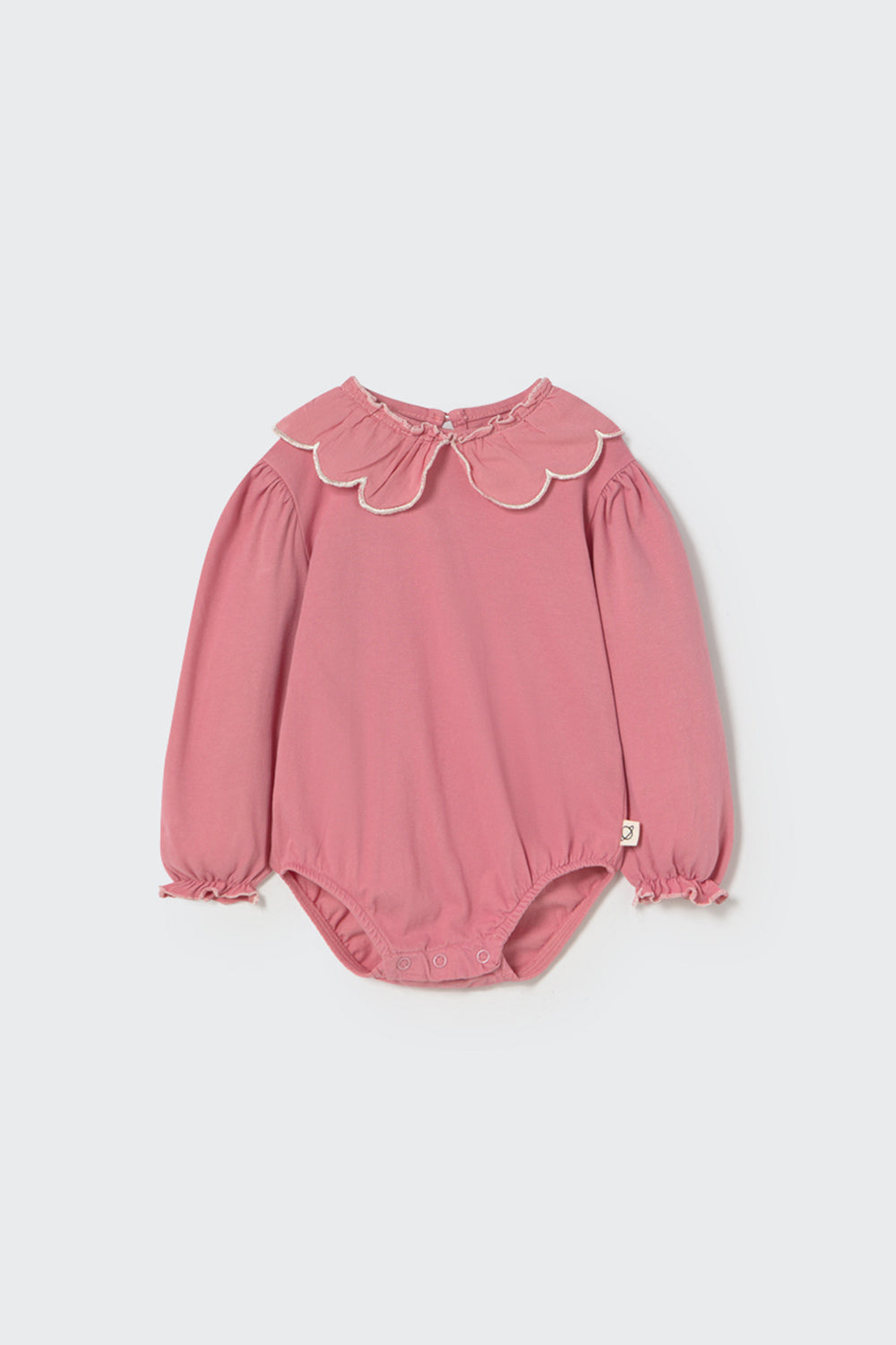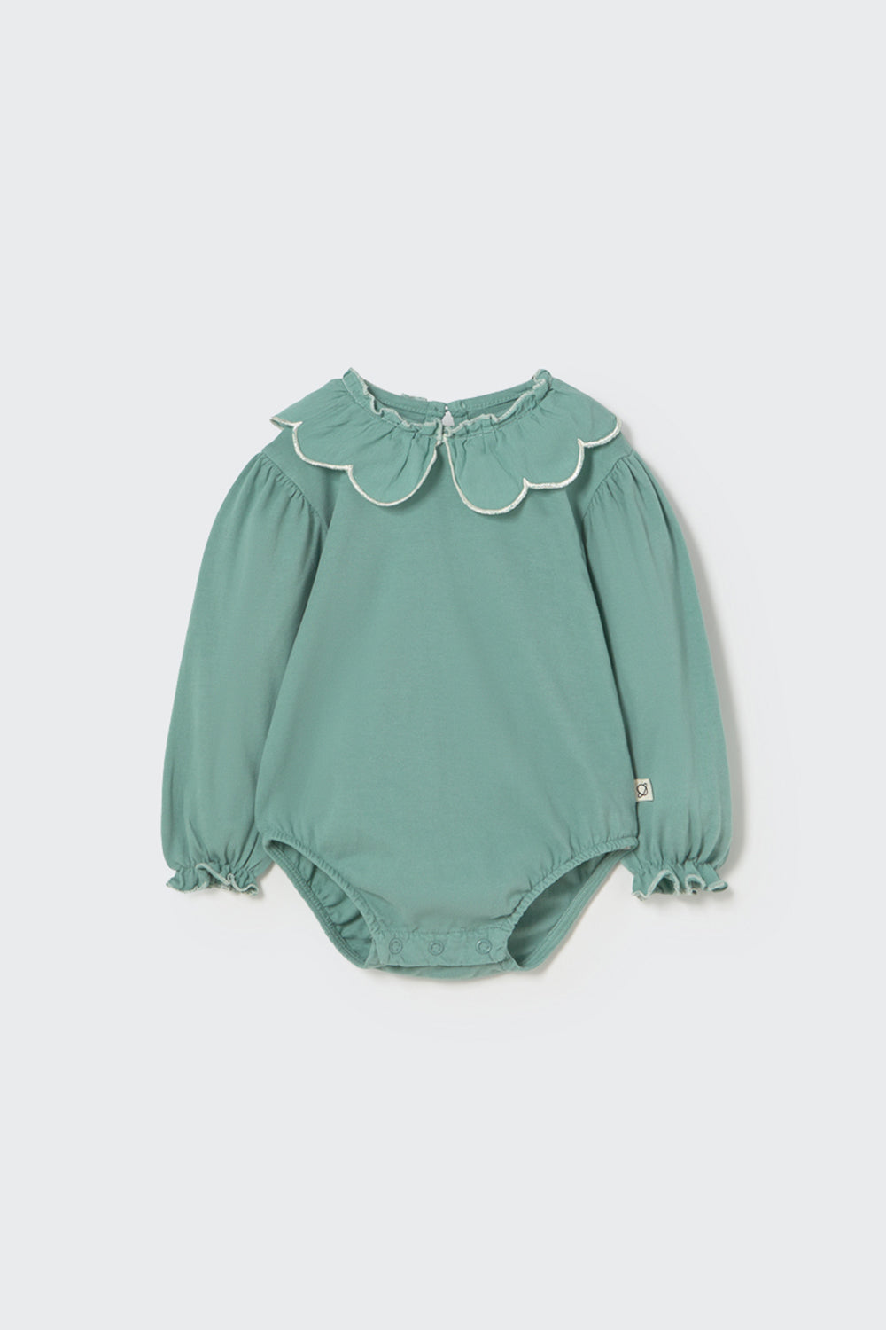 Body confeccionado en jersey de algodón orgánico con acabado cepillado para mayor calidez y suavidad. Presenta cuello de voile de algodón con volantes y ribetes de ribete ondulado, y puños fruncidos con volantes a juego. Las perneras elásticas y los botones a presión en el refuerzo facilitan su colocación. Abertura trasera en forma de lágrima para mayor comodidad. Diseñado para que recién nacidos, bebés y niños pequeños estén abrigados y cómodos.