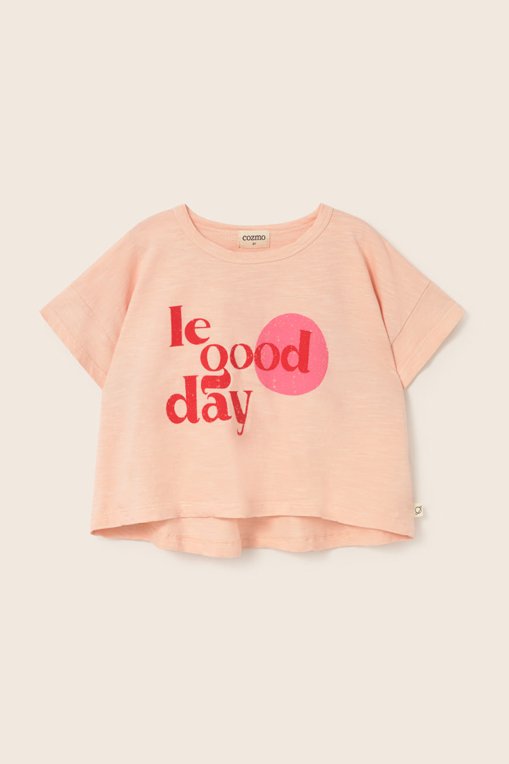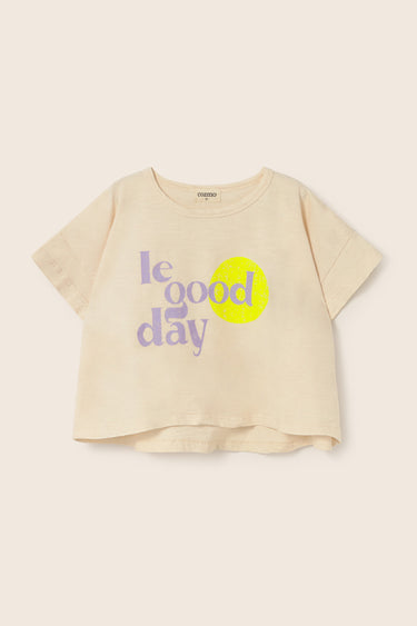 Camiseta para niña en algodón flamé muy ligero. Presenta cuello redondo, mangas cortas, bajo trasero más largo que el delantero y un motivo estampado con el mensaje “le good day”.
