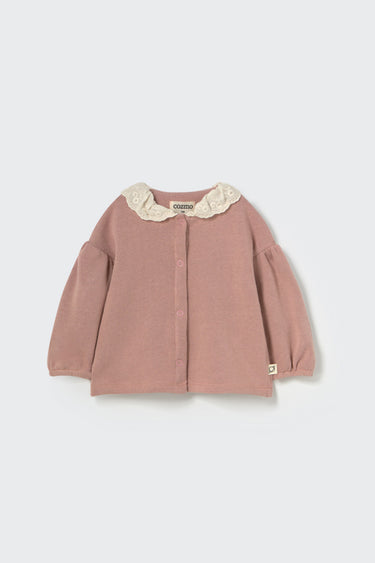 Este suéter tipo cárdigan para bebé está confeccionado en un punto suave y sedoso, cepillado por dentro y por fuera para una sensación cálida y extra suave. Presenta un cuello con detalles de encaje y una tapeta abotonada en la parte delantera. Las mangas largas abullonadas con puños elásticos proporcionan un ajuste suave, lo que hace que esta prenda sea tan cómoda como práctica, perfecta para los días más fríos.