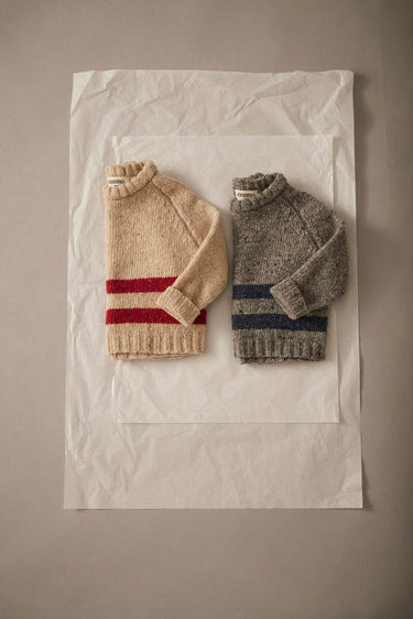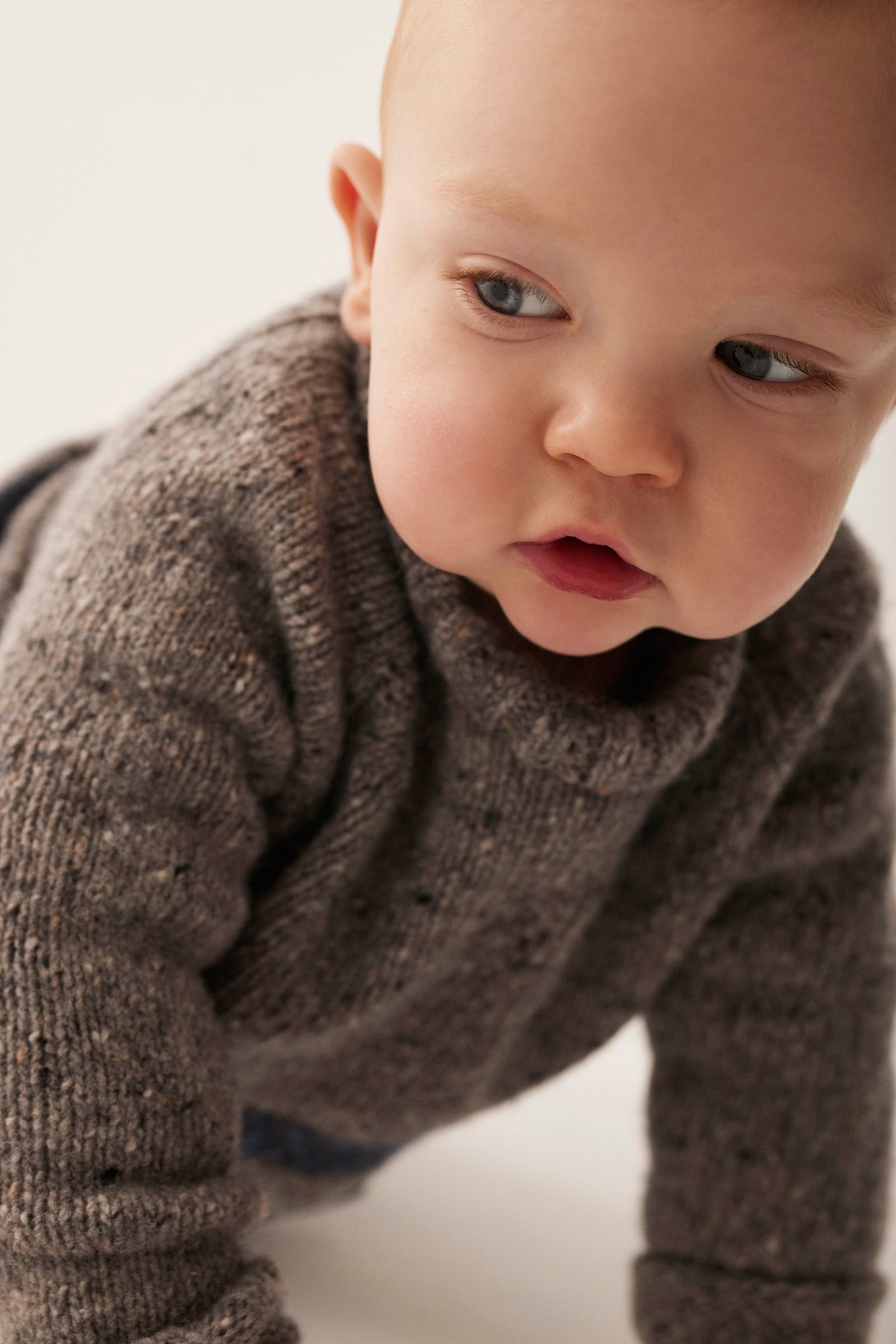 Jersey para bebés hecho de una mezcla suave y esponjosa de lana y poliamida reciclada en tricot. Cuenta con cuello, puños y bajo acanalados, mangas ranglán con costuras de punto trenzado y doble raya en la parte inferior. Textura jaspeada sutil. Cálido y confortable. Este jersey de bebé forma parte de nuestra colección de ropa reciclada para bebés.