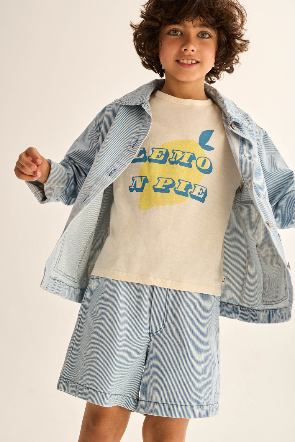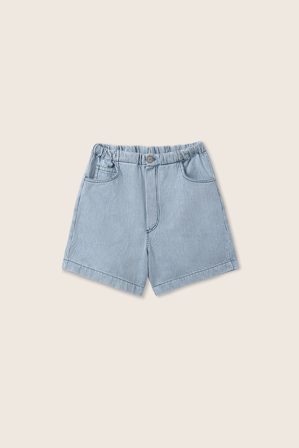Pantalones bermudas vaqueros de rayas para niño con cintura elástica ajustable y botón decorativo estilo denim. Presenta falso cierre delantero, bolsillos delanteros redondeados con bolsillo para monedas, y bolsillos traseros de parche con rayas horizontales.