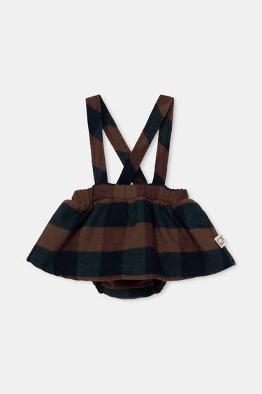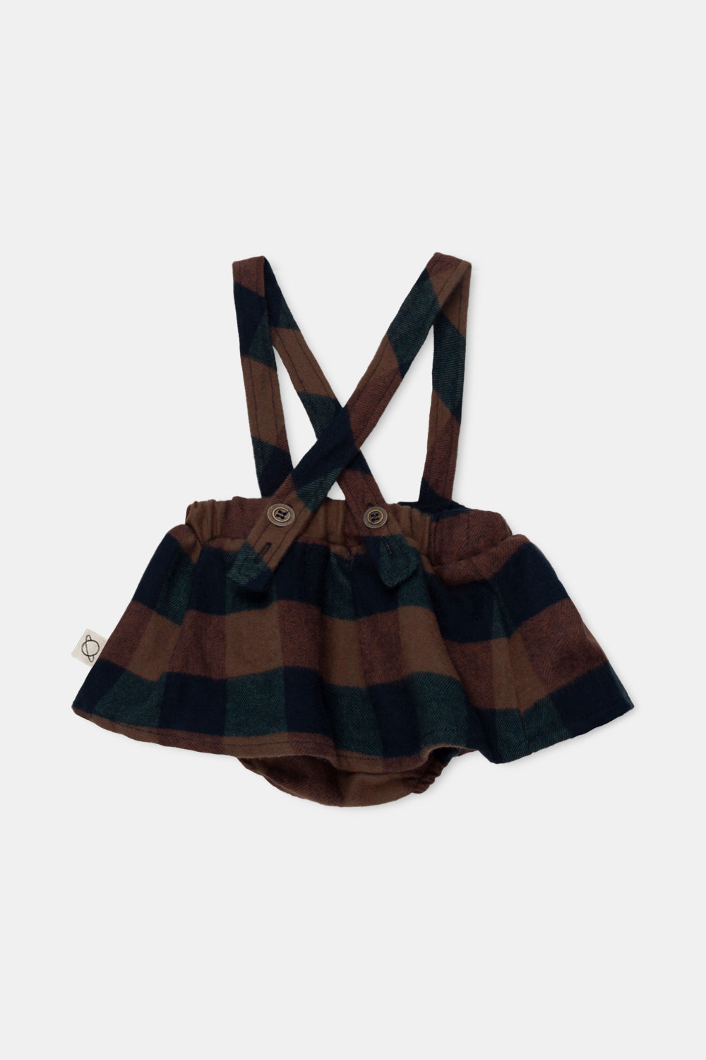 Estos pantalones cortos orgánicos para bebé, diseñados con un patrón de cuadros, tienen una sobrefalda, tirantes que se cruzan en la espalda y una cinturilla y medias elásticas. Un lazo decorativo en la cinturilla.