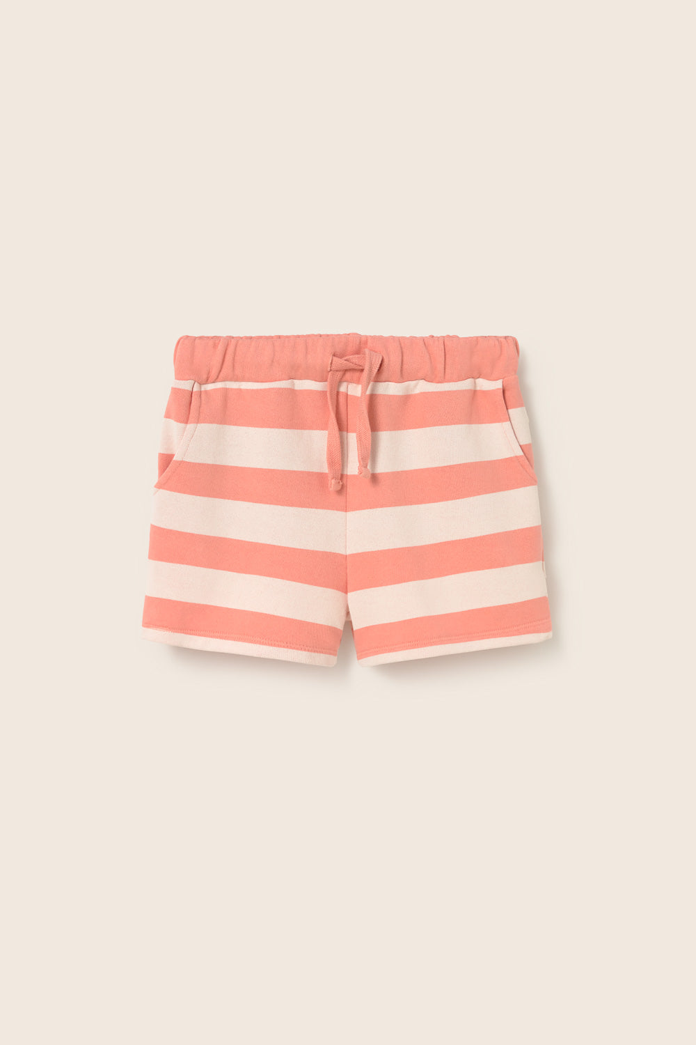 Pantalón corto de rayas para niño en felpa de algodón suave. Presenta cintura elástica con cordón ajustable y bolsillos laterales para un ajuste cómodo y relajado.