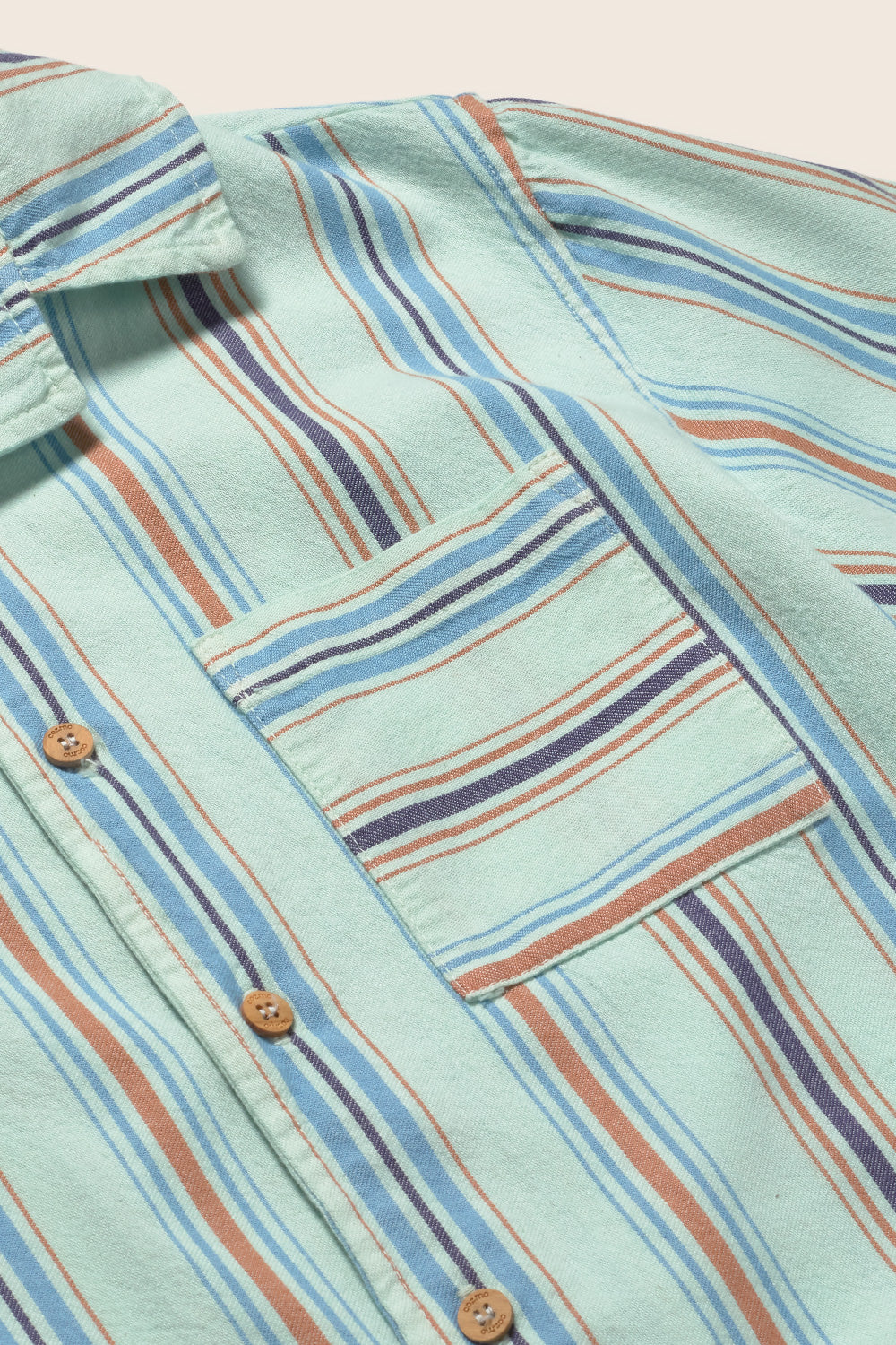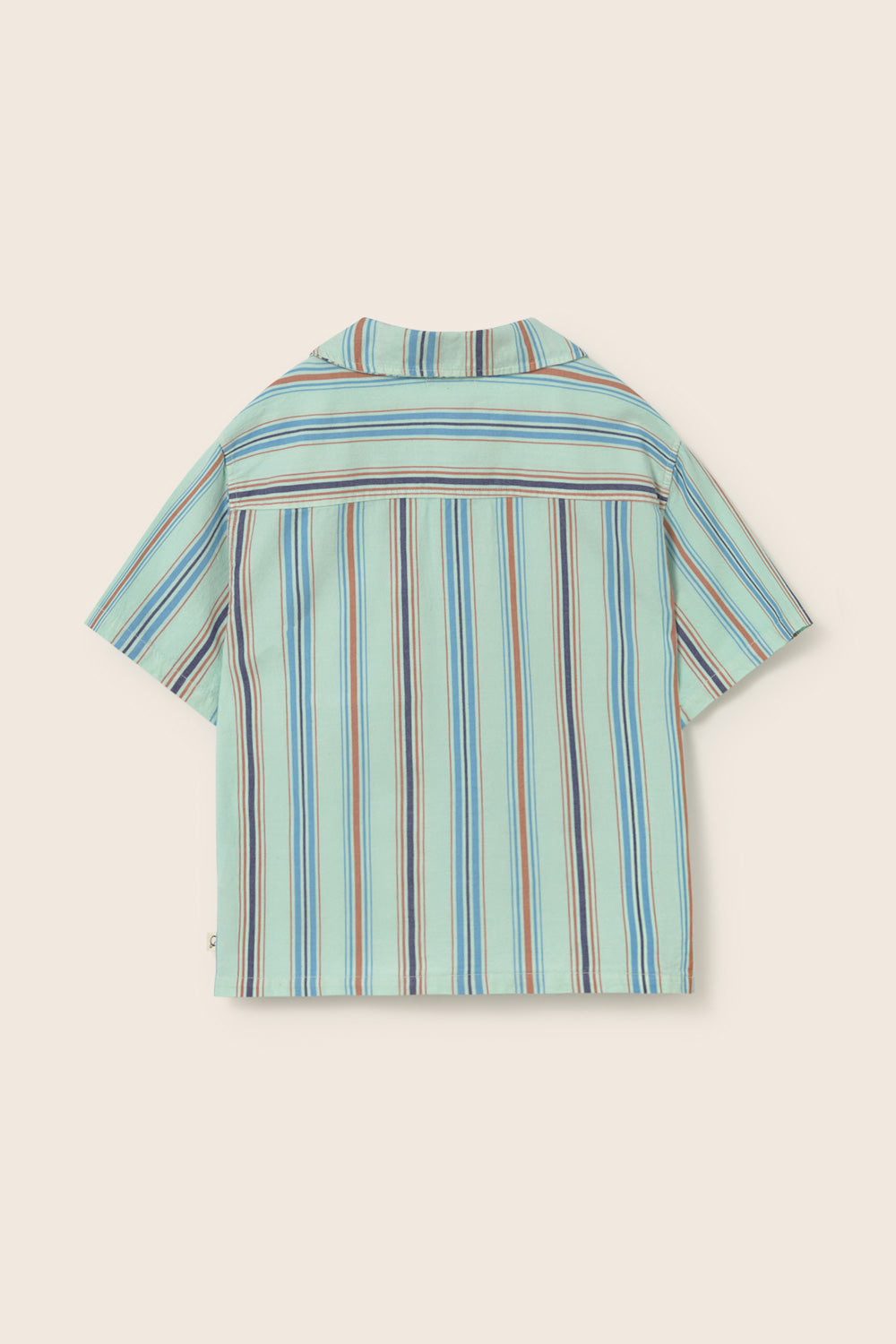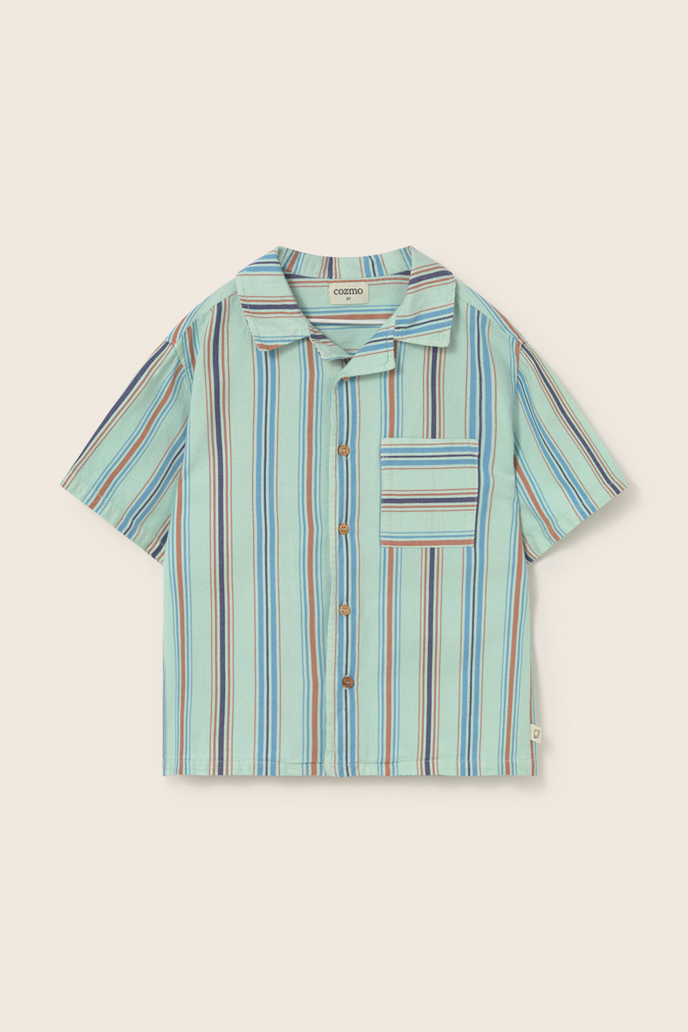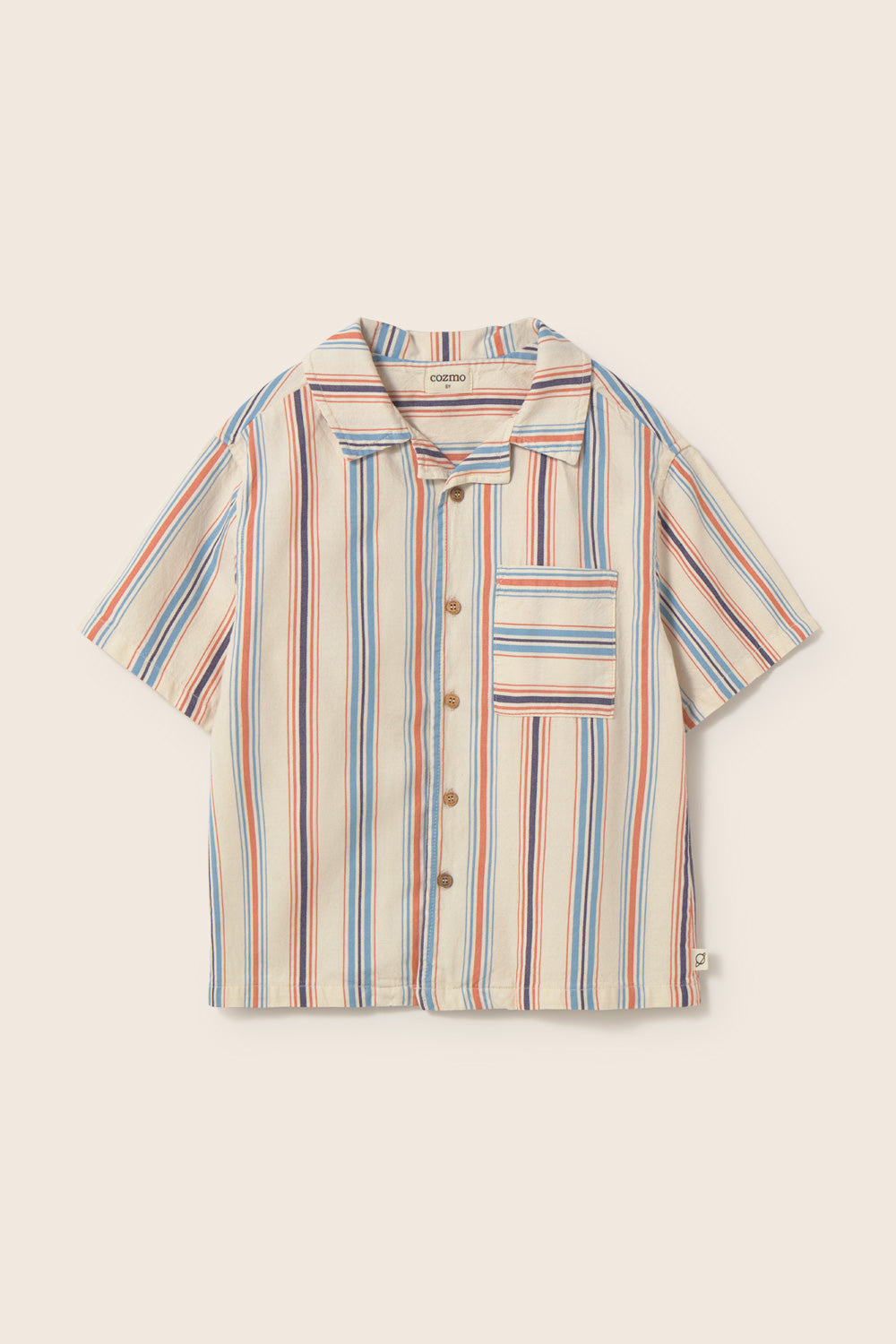 Camisa de rayas para niño en algodón suave y cómodo. Presenta cuello tipo campestre, hombros ligeramente caídos con mangas cortas, tapeta de botones en el delantero, bolsillo de parche en el pecho con rayas horizontales, espalda con canesú y bajo redondeado para un look clásico.
