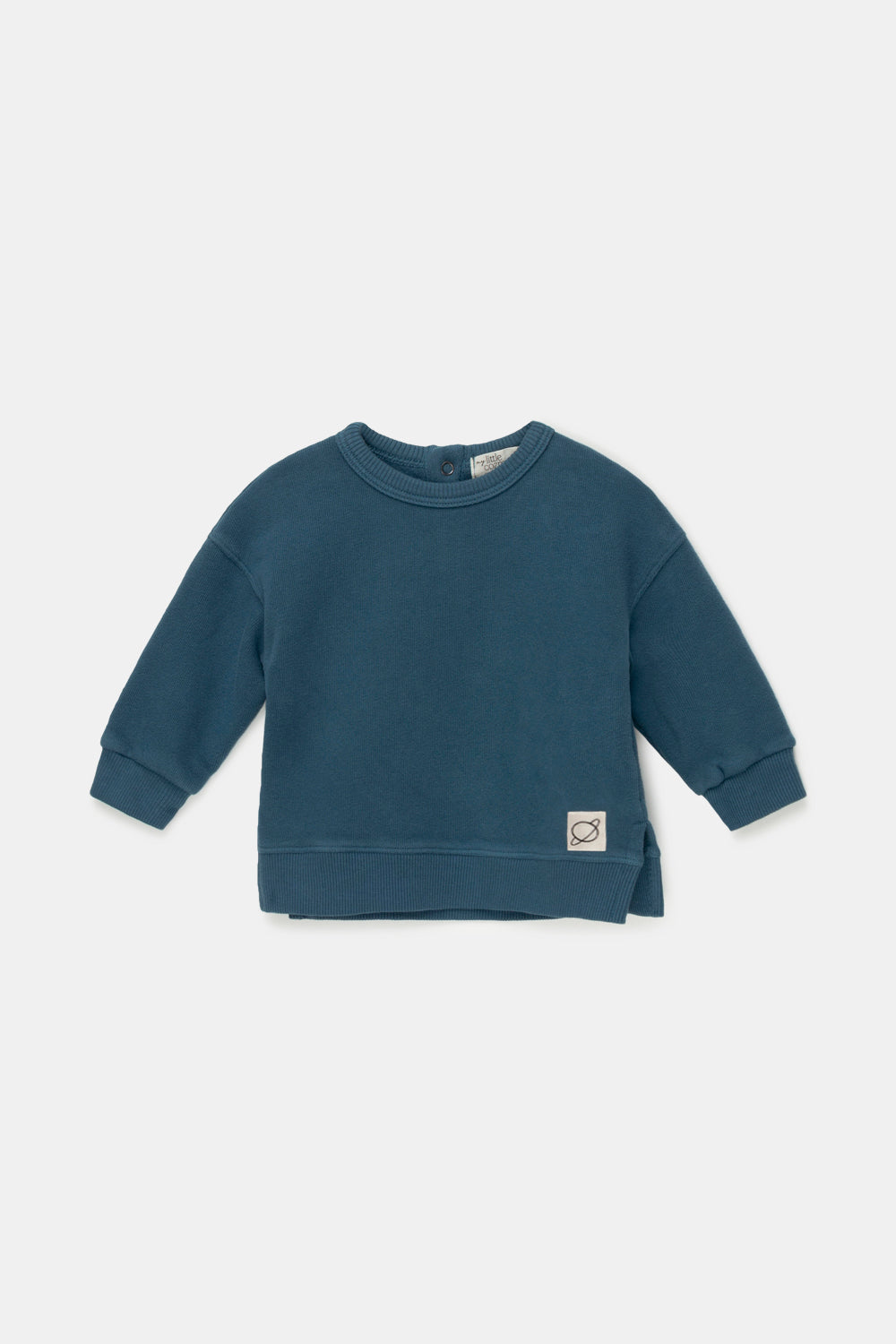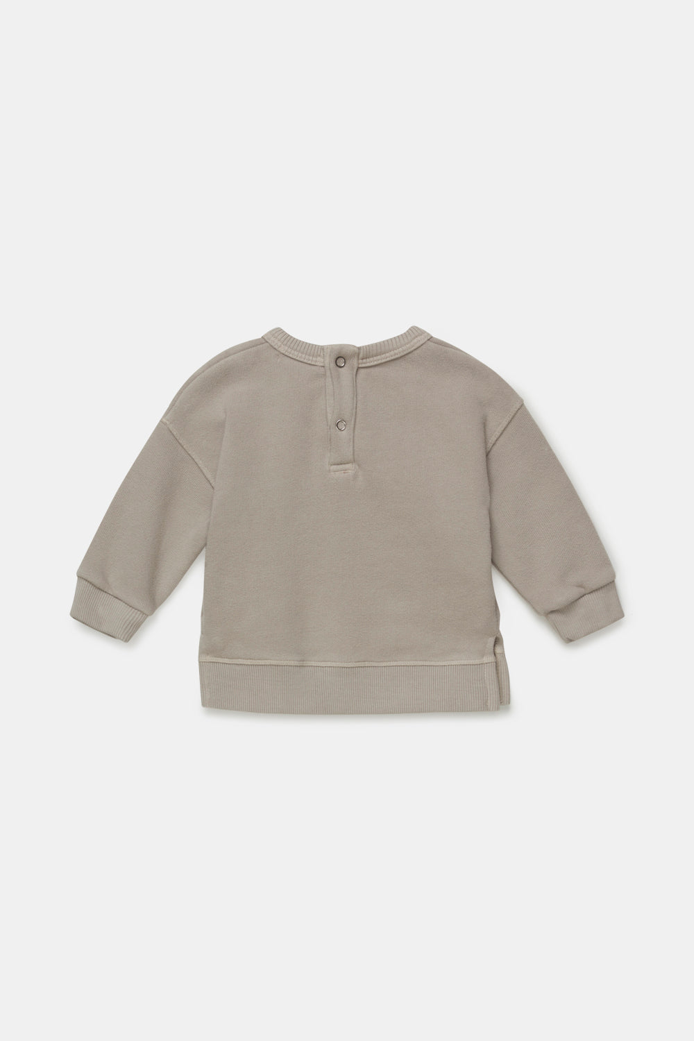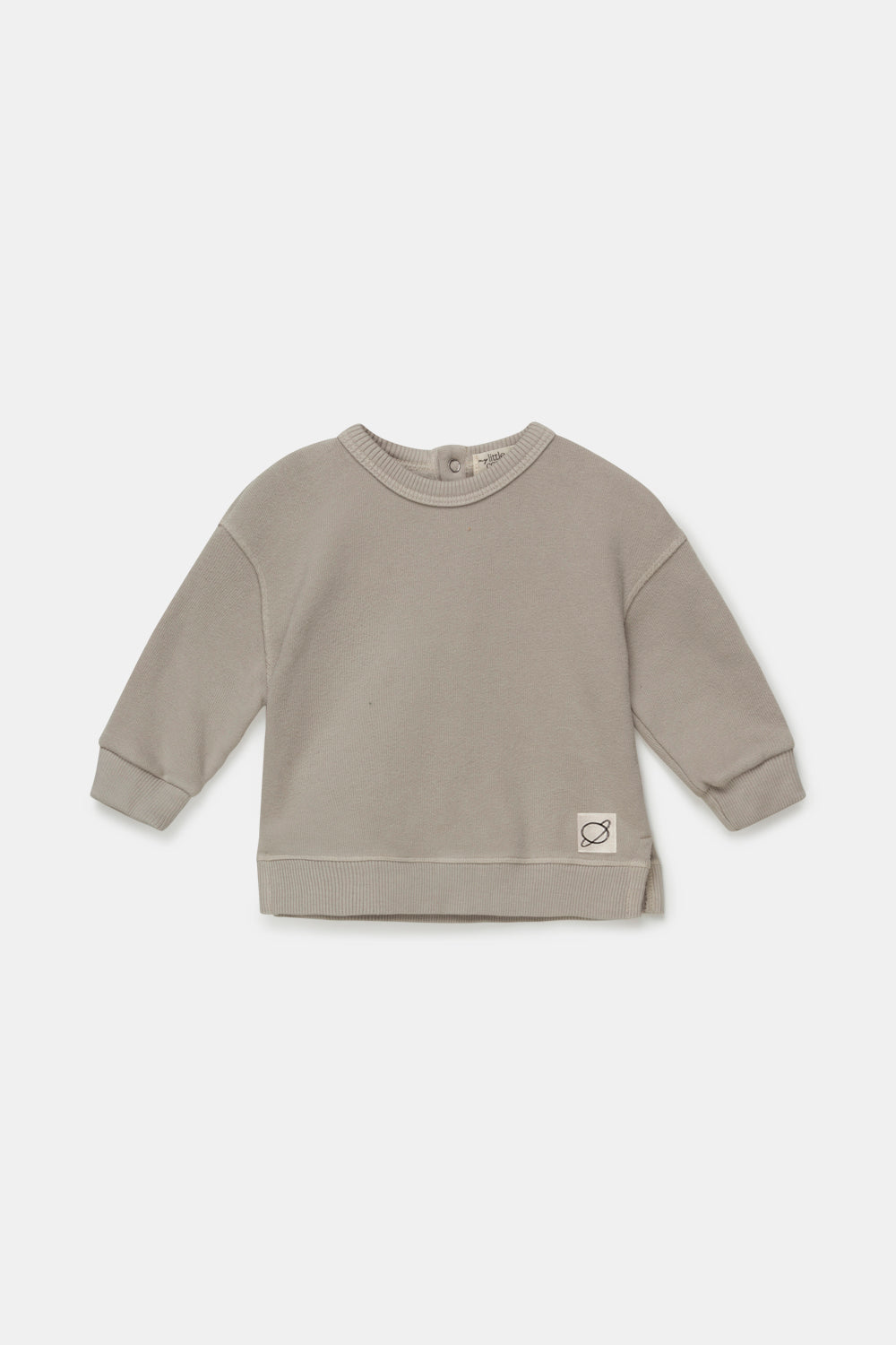 Esta sudadera orgánica para bebé tiene cuello redondo, botones en la nuca, hombros relajados, mangas largas, aberturas laterales y puños y dobladillo acanalados. Disponible en gris claro, azul, petróleo y marrón.