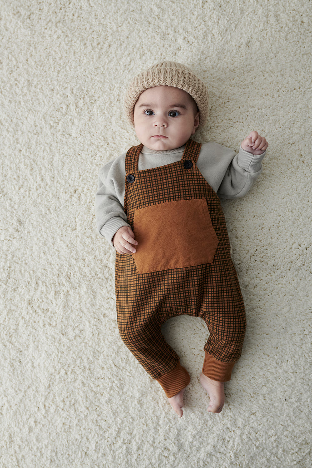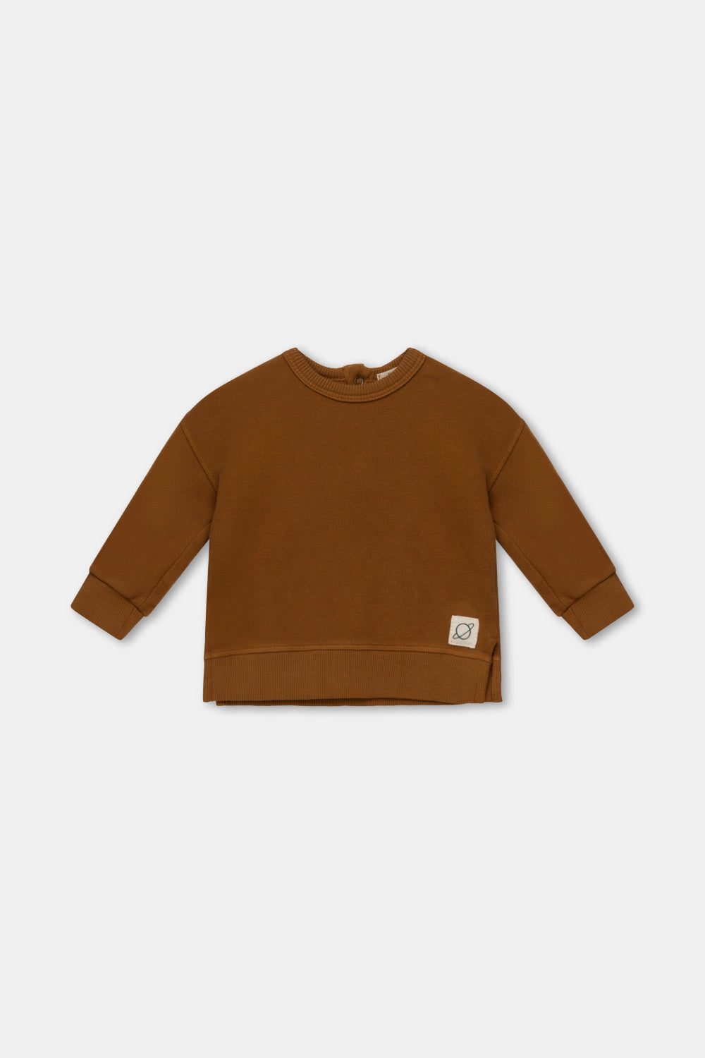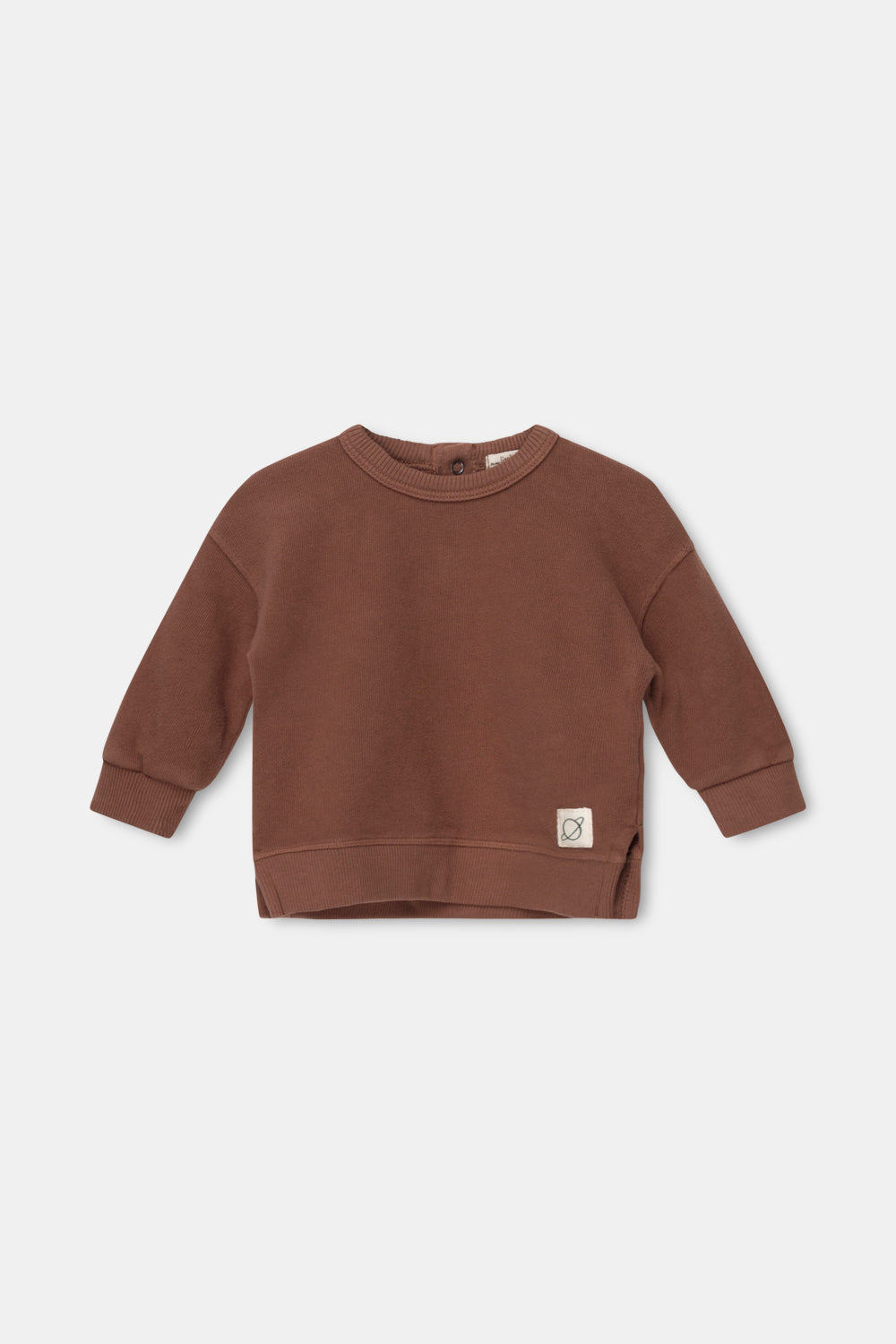 Esta sudadera orgánica para bebé tiene cuello redondo, botones en la nuca, hombros relajados, mangas largas, aberturas laterales y puños y dobladillo acanalados. Disponible en gris claro, azul, petróleo y marrón.