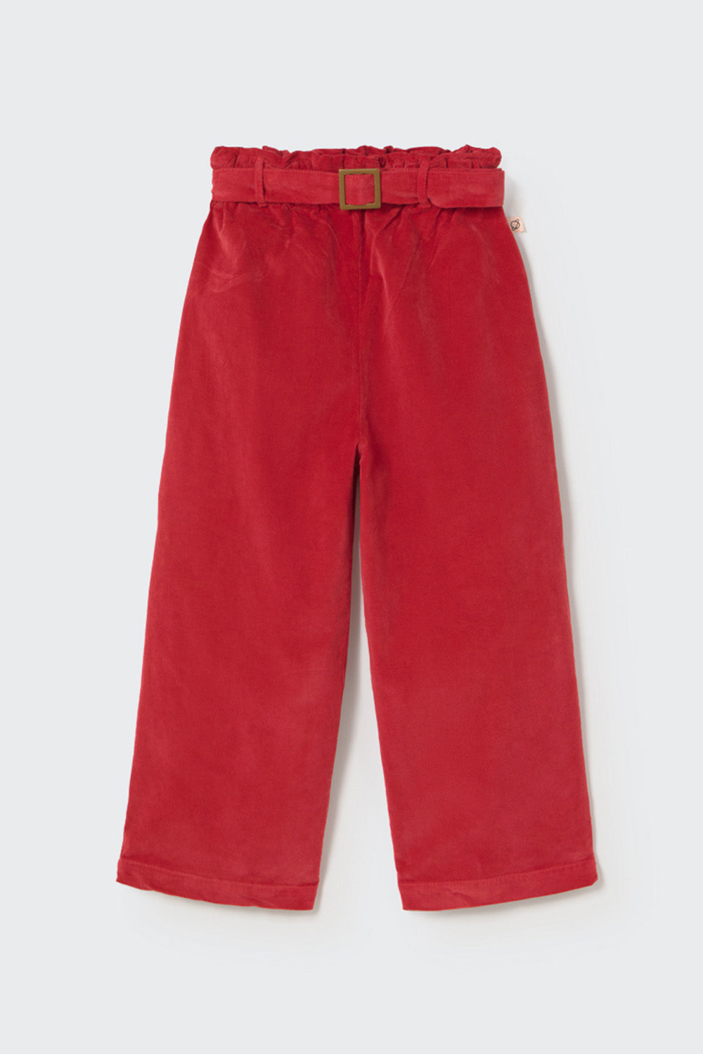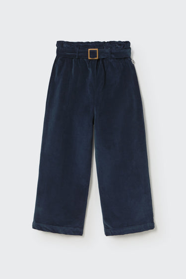 Pantalón para niñas de terciopelo elástico de algodón sostenible con textura suave y aterciopelada. Lleva cintura elástica con trabillas y un cinturón fijo que se ata delante con una hebilla metálica. El corte ancho en las piernas ofrece un ajuste cómodo y relajado.