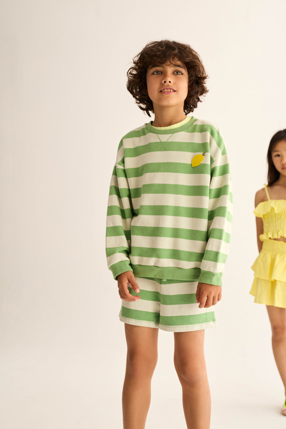 Pantalón corto de rayas para niño en felpa de algodón suave. Presenta cintura elástica con cordón ajustable y bolsillos laterales para un ajuste cómodo y relajado.
