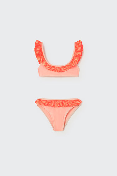 Este bañador para niña tipo bikini destaca por sus volantes a rayas tanto en el escote como en la cintura de la braguita.