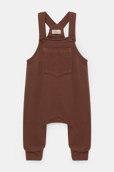 Este peto de bebé de punto orgánico tiene tirantes con botones en la parte delantera y un bolsillo en el pecho. El bolsillo en el pecho y los dobladillos están cosidos con la parte trasera de la tela. Está compuesto por un 96 % de algodón orgánico y un 4 % de licra. Disponible en azul, marrón, gris claro y petróleo.