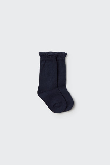Calcetines de algodón peinado orgánico , cálido y con certificación GOTS. Presentan un ribete de volante en el puño y ofrecen un ajuste cómodo y flexible, perfecto para que las niñas estén abrigadas y cómodas.