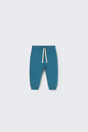 Pantalones para bebé confeccionados en felpa cepillada de algodón orgánico. Exterior liso e interior suave, cálido y agradable. Cintura elástica de canalé con cordón decorativo, falso bragueta y bajos de canalé para un ajuste cómodo y seguro.