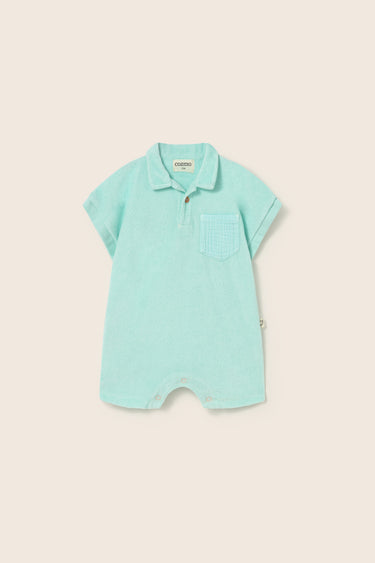 Pelele para bebé en suave felpa de rizo. Presenta cuello tipo polo con tapeta de botones, hombros ligeramente caídos con mangas cortas rematadas con puños de canalé, bolsillo de parche en el pecho en algodón de gasa, piernas cortas y cierre con botones a presión en la entrepierna para facilitar el cambio.