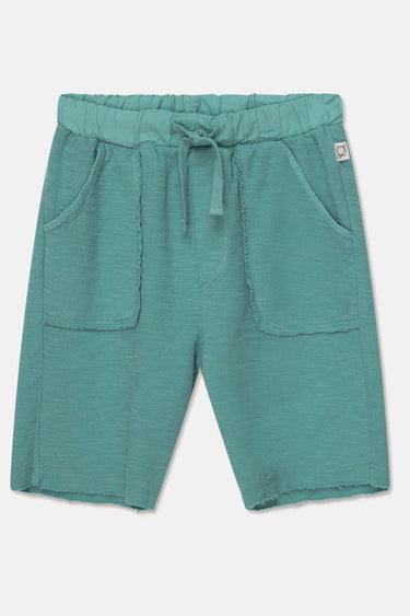 Bienvenidos a los pantalones favoritos de sus hijos. Estos pantalones cortos bermudas de tejido orgánico de doble cara son los más cómodos. Cuentan con dos bolsillos de parche en la parte delantera y una cinturilla fruncida con cordón. Estos pantalones cortos bermudas de tejido orgánico de doble cara para niños están tejidos con un 98 % de algodón orgánico certificado por OEKOTEX y un 2 % de poliéster. Disponibles en verde, petróleo, rosa y azul cielo.