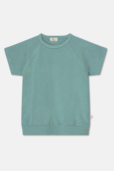 La llamamos sudadera, pero puedes usarla como camiseta. Esta sudadera orgánica de doble cara para niños es muy versátil y tiene cuello redondo y mangas cortas. Está tejida en un 98 % de algodón orgánico con certificación OEKOTEX y un 2 % de poliéster. Disponible en verde, petróleo, rosa y azul cielo.