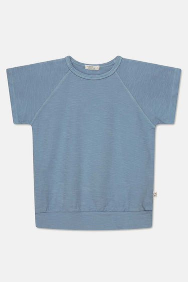 La llamamos sudadera, pero puedes usarla como camiseta. Esta sudadera orgánica de doble cara para niños es muy versátil y tiene cuello redondo y mangas cortas. Está tejida en un 98 % de algodón orgánico con certificación OEKOTEX y un 2 % de poliéster. Disponible en verde, petróleo, rosa y azul cielo.