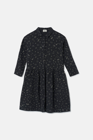 Vestido de gasa suave con estampado integral de 'cozmo'. Cuello camisero, mangas largas y cierre con botones en la parte delantera. Falda fruncida. Efecto arrugado. 100 % algodón. Tejido Las fibras de esta prenda están certificadas como sostenibles por la Better Cotton Initiative (BCI).