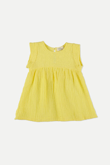 Vestido de algodón tejido con textura tipo gasa y bordado de ojales en la parte superior. Escote redondo con cierre de encaje en la espalda. Teñido en prenda. 100% algodón.
