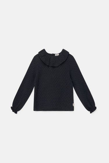 Esta blusa con textura de plumeti orgánico presenta un cuello con volantes, una tapeta posterior con botones, mangas largas y puños elásticos con volantes. Está disponible en color stone, rosa, gris oscuro y mostaza. La blusa está confeccionada en algodón 100 % orgánico certificado por GOTS y OEKO-TEX.
